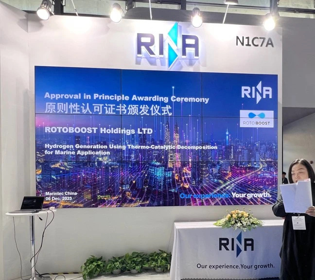 12月6日,意大利船级社(RINA)在上海海事展展台上为 ROTOBOOST Holdings LTD 自主研发的船用天然气催化热裂解制氢技术颁发原则性认可证书。