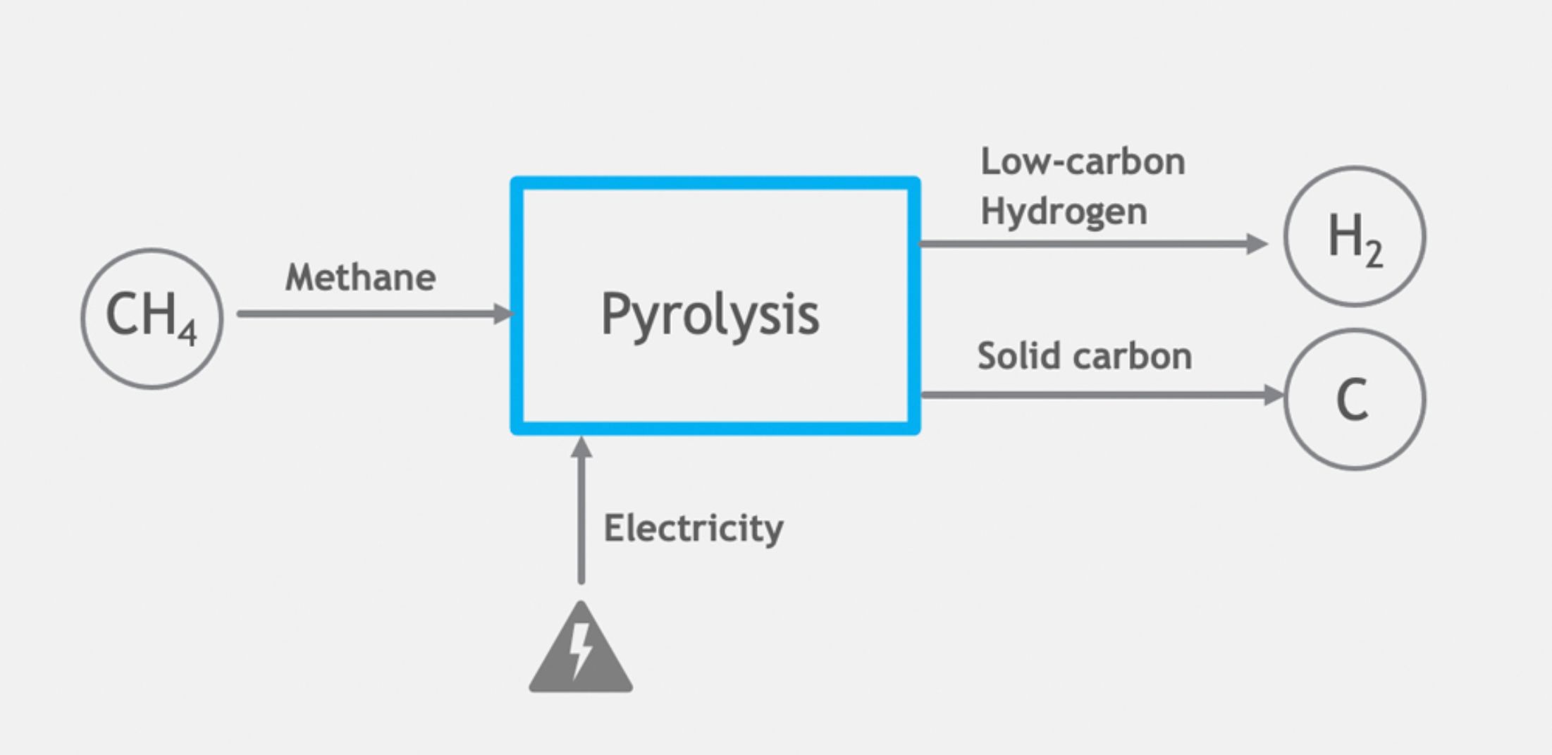 The methane (CH₄) pyrolysis process [also known as CH₄ cracking or turquoise hydrogen (H₂) production] is a thermal (high-temperature) breakdown of CH₄ into H₂ gas and solid carbon. The process typically takes place above 800°C in the absence of oxygen. The main products of the CH₄ pyrolysis process are H₂ and solid carbon, commonly known as carbon black, graphite and graphene. The process of CH₄ pyrolysis is as follows: